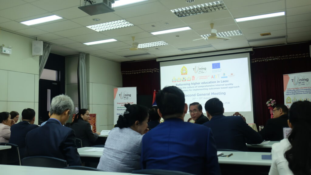 On April 3, 2025, right after the First REAL General Meeting, REAL Open Session no 1 was conducted in Vientiane, Lao PDR. This was the first time the REAL project was presented to key actors from beyond the consortium: representatives of the fifth Lao public university – UHS, and representatives of the labour market, such as Lao Association of Travel Agents, INTHIRA Group, 108jobs, Sitthi Logistics Company, and L-JAT Airport and Terminal Service Company, whose engagement with the project activities will be crucial  in the upcoming months, when the Consultation about the Desired Graduate Profiles will seek in inputs from employers and recent graduates. The presentations made by representatives of the REAL Programme Teams from the four Lao public universities – Dr. Lotchana Taysayavong (CU), Dr. Latsanyphone Soulignavong (NUOL), Thavone Panmanivong (SU), & Khonesavanh Norasane (SKU) – and REAL National Task Force members – Dr Ammany Norrinl, Deputy Director General HE, MOES; Asst. Prof. Thongsouk Keomany, NUOL Vice President for Academic Affairs; Dr. Somchay Phaignavong, SU Vice President for Administration; Assoc. Prof. Dr. Khoune Sackbouavong, SKU President; and Dr. Phonesavanh Thepphasoulithone, CU Acting President; – were followed by discussion with active participation of all those attending. Delegation of the European Union to Lao PDR was represented by Mrs. Saymano Sanoubane.